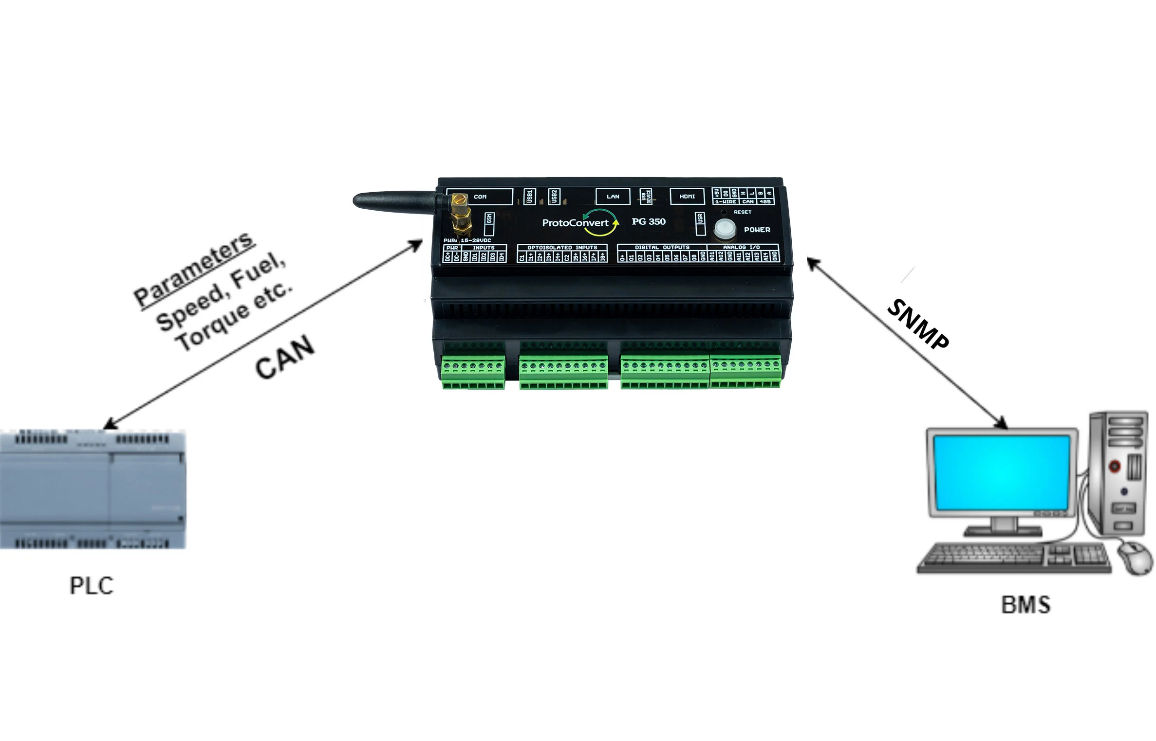 PG-104-194 The gateway supports SNMP and CAN protocols. The May protocol interface can be set up to act as a passive client, meaning it will listen for incoming CAN messages. The data from the CAN channel is read by the gateway and converted to SNMP.