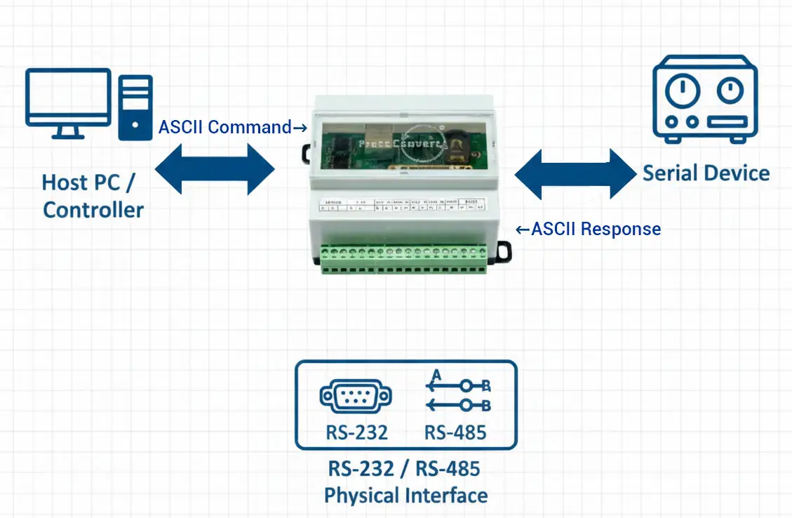 This Gateway solutions is a serial protocol. It is also a question and answer communication protocol where in a host PC uses these characters to send commands to a device and there by receives replay back from that device. It sends and receives formatted strings of ASCII characters via RS-232/485 physical interface. The message strings contain the combination of the information like message header, unit id, address of a variable, variable data, length of the variable in bytes, length of the message in bytes, and a checksum.