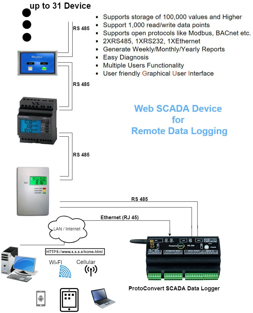 Our Modbus Datalogger SCADA gateway can communicate with field devices works on Modbus or BACnet protocols. It can read or write data back on/from device. It has on board memory, in which it can store 1,00,000 data points at any time. This converter provides an intuitive Web interface. On which you can display data and control the system by writing back.