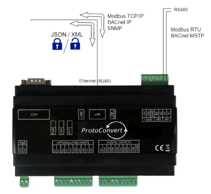 The PR-WS-100-101-102-103-113 is an embedded remote monitoring and control solution for Modbus / BACnet devices. This unit can connect with Modbus RTU / BACnet MSTP based field slave devices (on RS232 or RS485) and provide the data in JSON / XML format.