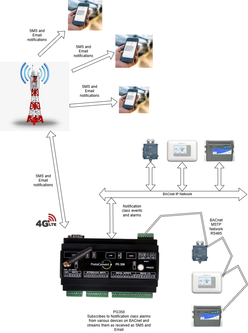 The PG350 BACnet gateway is an innovative gateway module designed to enhance the communication of critical alarms within building management systems. This device subscribes to BACnet Notification Class objects from various devices across the network, collecting detailed alarm messages and event notifications. Once subscribed, the gateway module processes these notifications and streams them in real-time over SMS and email to designated recipients. By leveraging this gateway, building operators and stakeholders can receive immediate alerts regardless of their location, enabling quick response times and ensuring that critical events are addressed promptly and efficiently. This solution seamlessly integrates with existing BACnet systems, providing a scalable and reliable means of keeping all relevant personnel informed of important developments within their facilities.