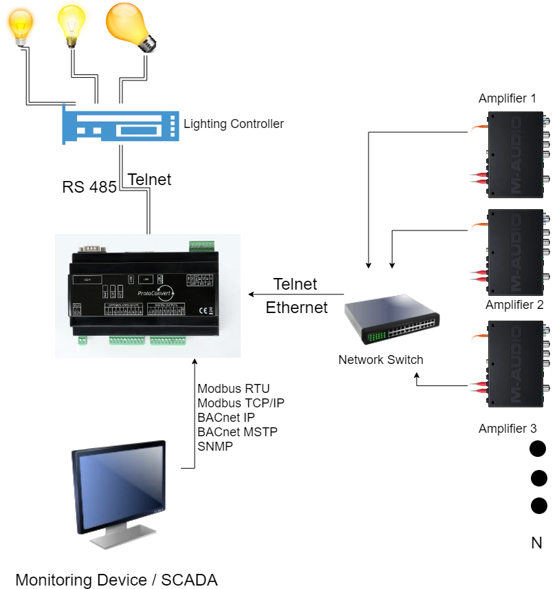 In a theatre there is range of Amplifiers that works with Telnet on Ethernet port to monitor and control the sound system through SCADA or BMS that works on SNMP Protocol.